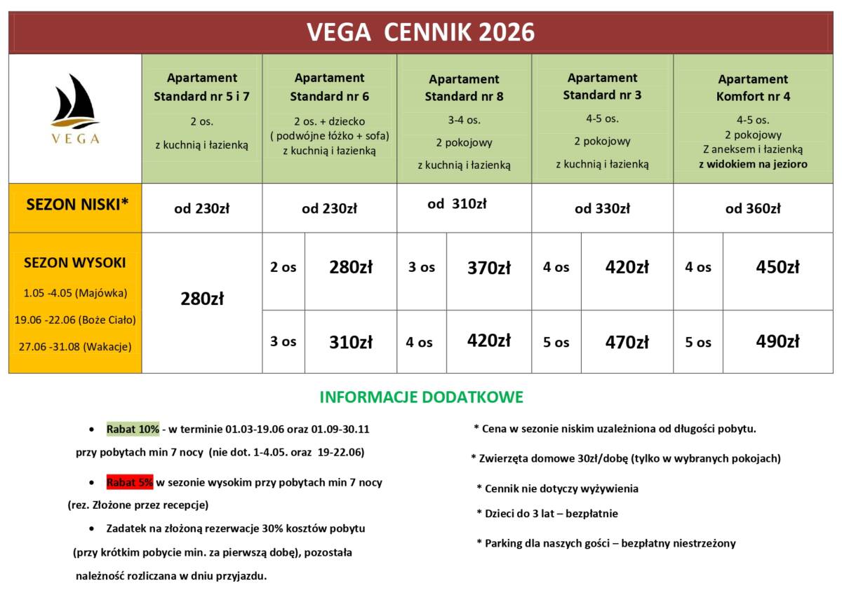 Vega dysponuje bardzo dobrze wyposażonymi apartamentami 2, 3 i 4 osobowymi. Każdy z apartamentów posiada w pełni wyposażone zaplecze kuchenne. Na dachu obiektu znajduje się taras widokowy, z którego rozciąga się przepiękny widok na Jezioro Charzykowskie i miejscowość Charzykowy. Obiekt posiada własny parking. To doskonałe miejsce noclegowe i punkt wypadowy dla miłośników sportów wodnych, wędkarstwa czy grzybobrań, którzy mają jednak ochotę na odrobinę kurortowych rozrywek. W razie niepogody można wybrać się do Parku Wodnego, który znajduje się 10 minut drogi samochodem od Vegi, lub zwiedzić Chojnice, urocze miasteczko z wyremontowaną starówką.