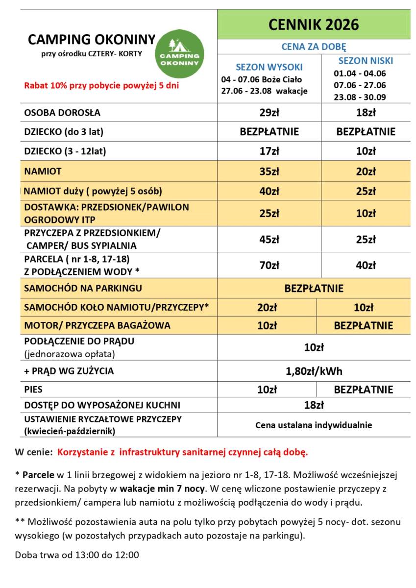 - bezpłatny parking na jedno auto dla każdego punktu/stanowiska campingowego