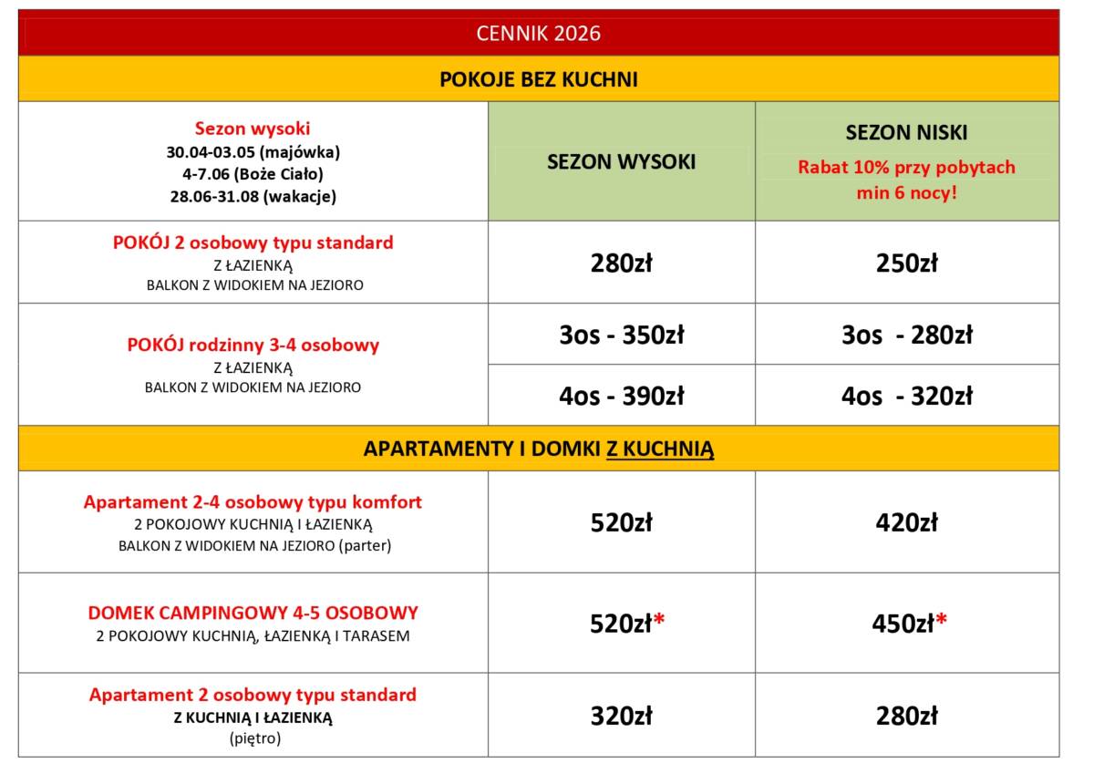 * Dodatkowa osoba w pokoju/domku +40zł/dobę